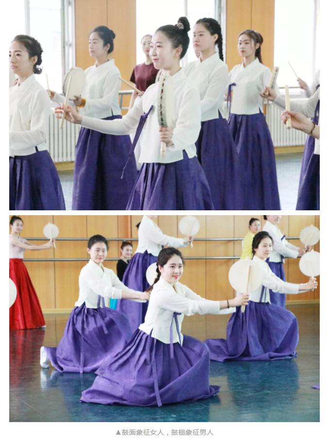 黄仙子老师、金英花老师将带领二班学员们,进行《手鼓舞基本》与《礼仪》的学习。身着紫色朝鲜族舞蹈服的采风团员们,古朴而高雅,似花般嫣然,似水般轻盈,宛如一弯清泉流淌着深不见底的风韵。