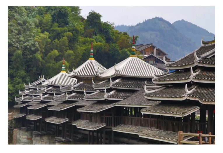永济桥,位于广西三江侗族自治县林溪乡程阳村林溪河畔,是一座石拱桥,全长96米,宽4米,高7米,跨澄江河上,是保存至今最完美的石拱桥之一。程阳永济桥,又称程阳桥、程阳风雨桥等,始建于1912年,历时12年。从桥的结构上看,桥下部分为青料石垒砌的二台三墩,桥墩为六面柱体,上下游均为尖形,迎水角68度;桥中间部分为密布式悬臂托间柱支梁木质桥面,共19间桥廊;桥上部分为木质梁柱凿榫衡接构成重檐翘角,层次分明的廊亭体系,共有五座塔阁式桥亭。