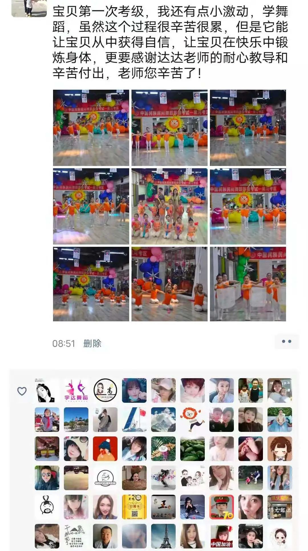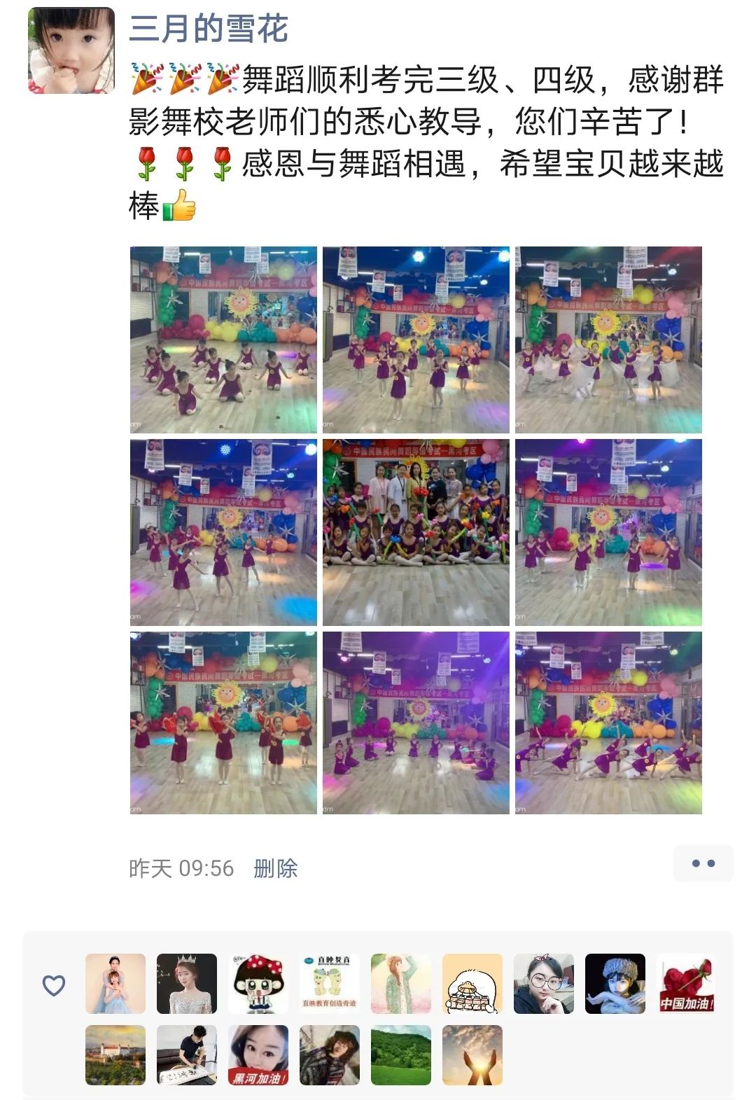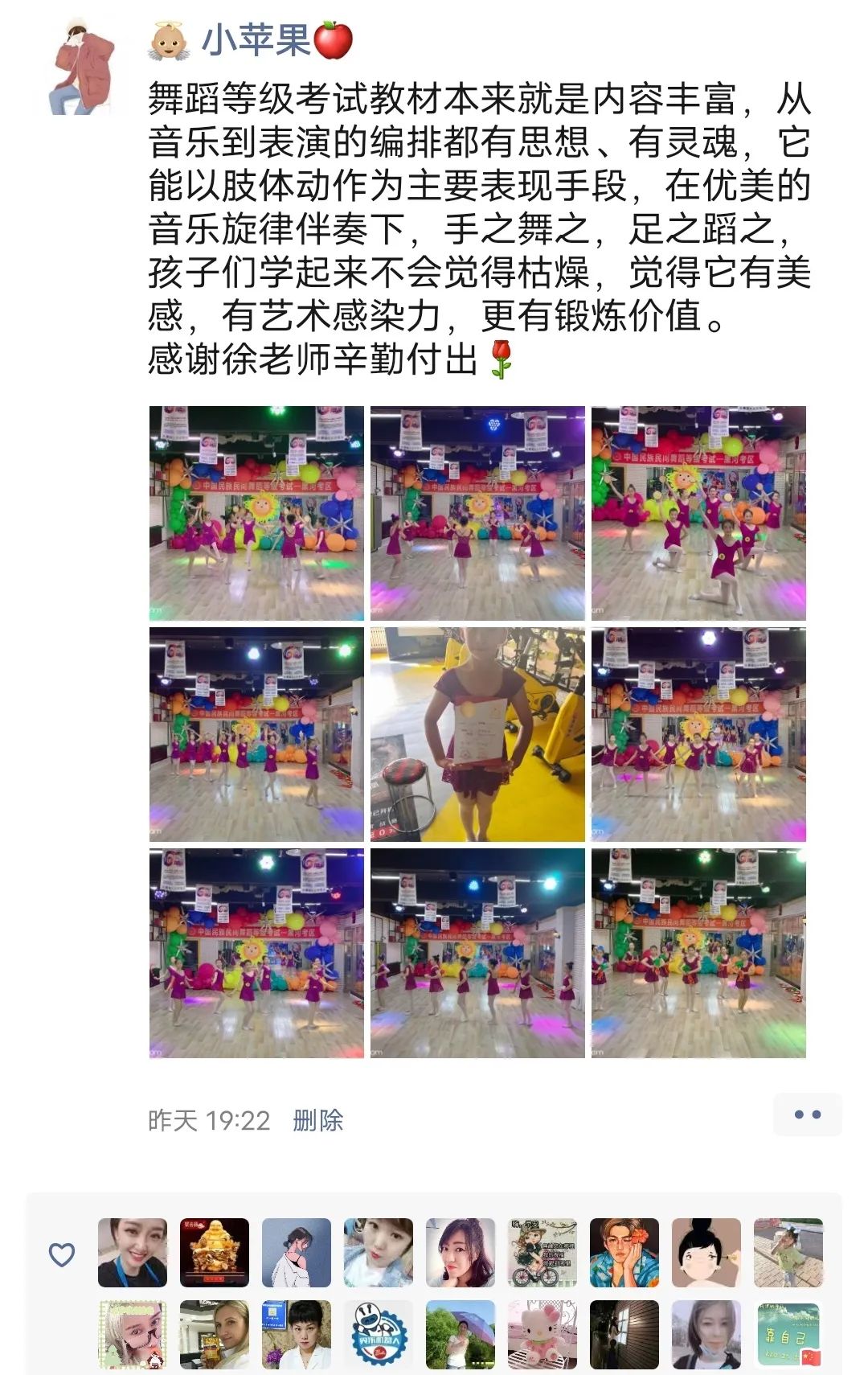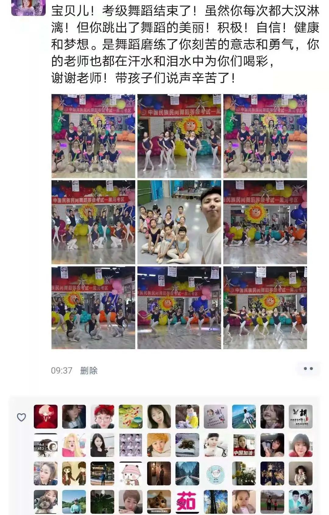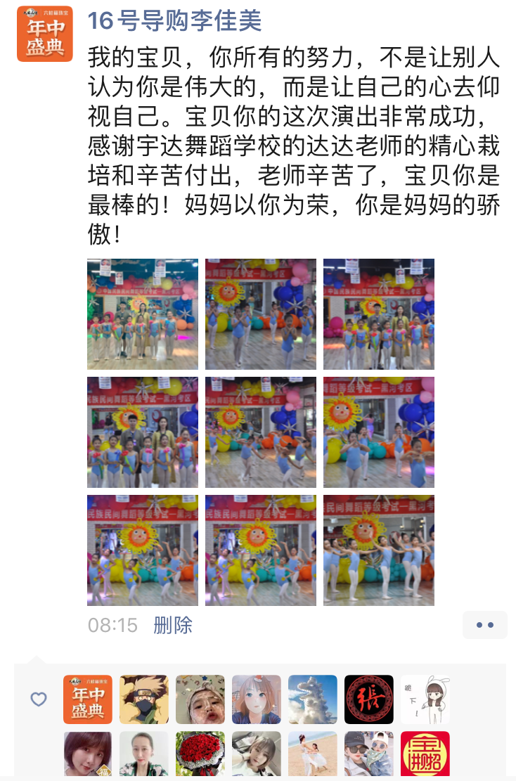 从不会穿舞蹈鞋,到现在可以独立站在舞台上完成演出,我很欣慰。感谢老师的付出与陪伴,一级到现在的十级,切实的看到了孩子的成长,树立了孩子的自信心,同时也体会到了团队的凝聚力。
