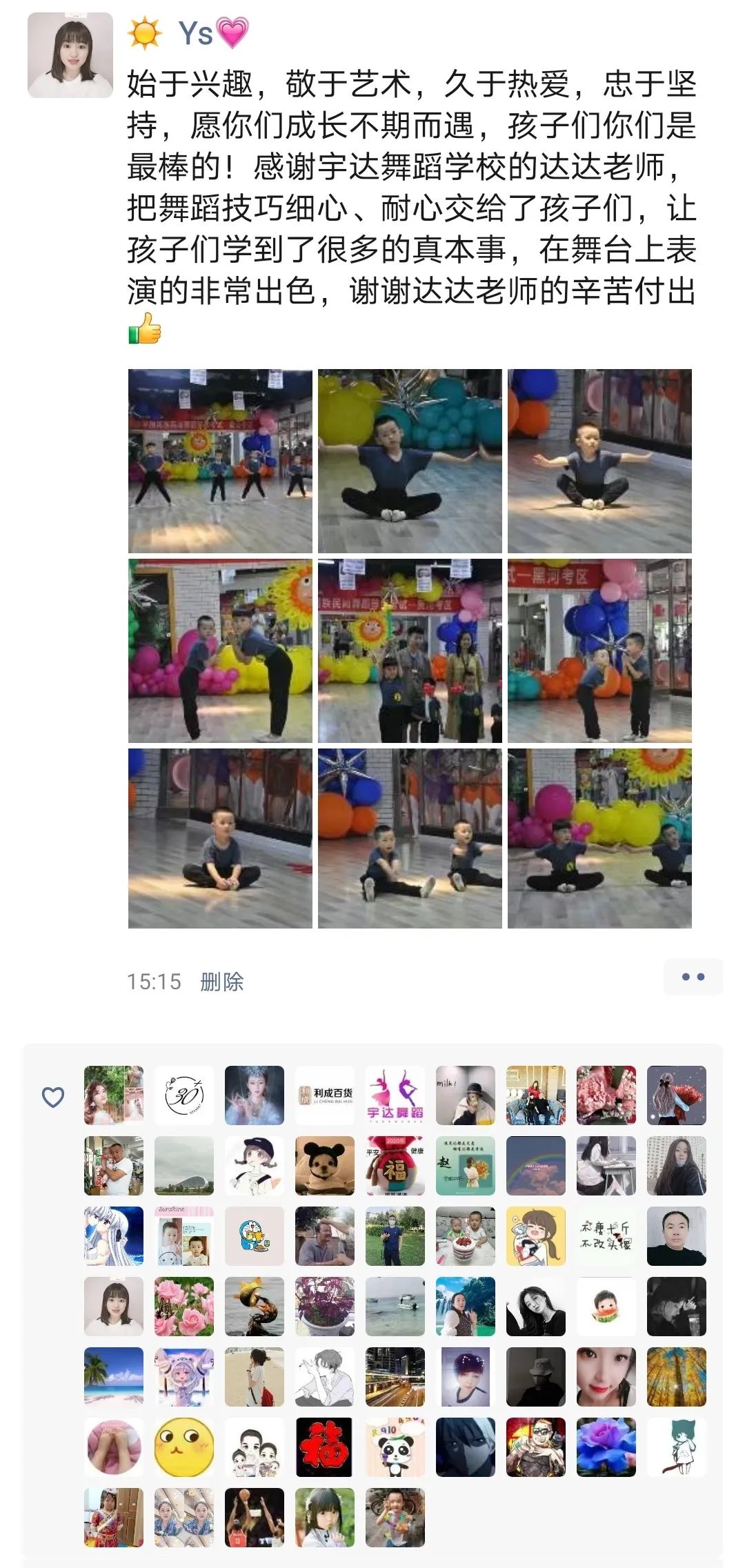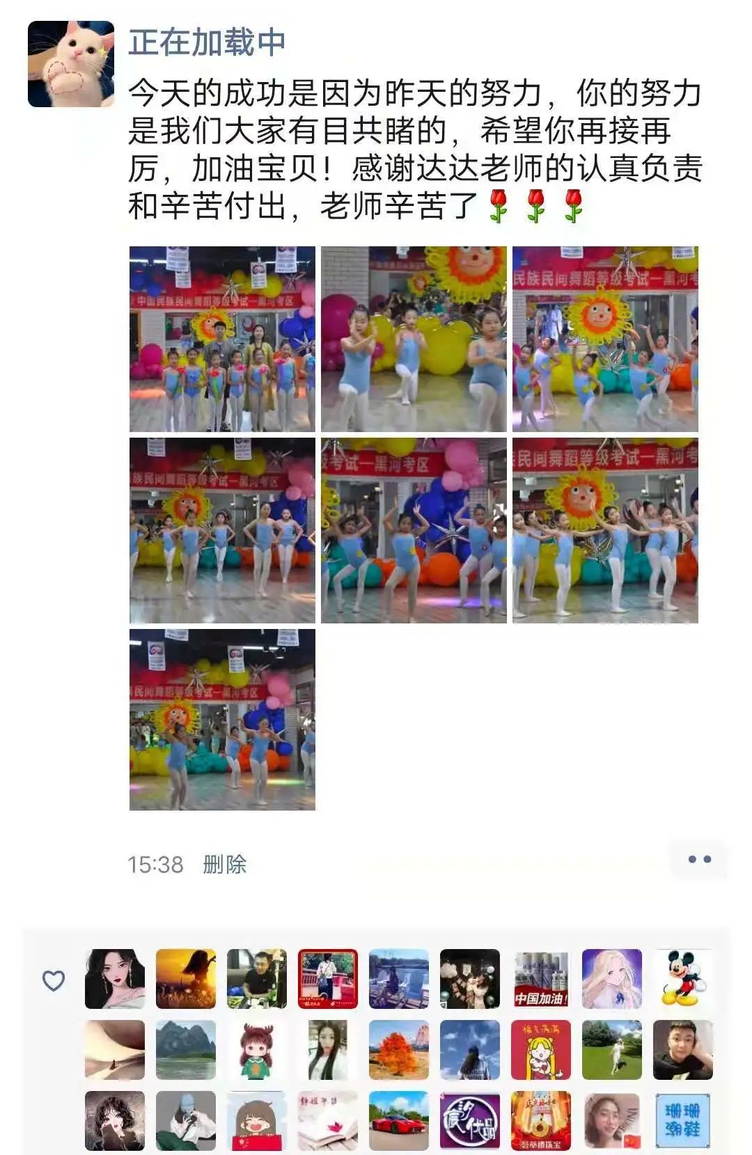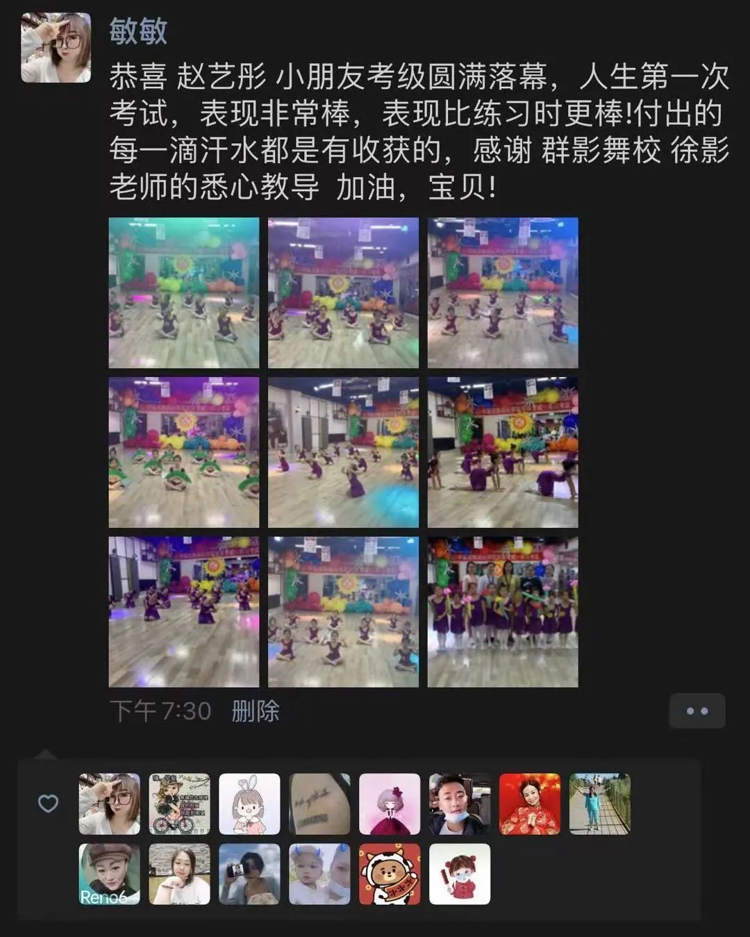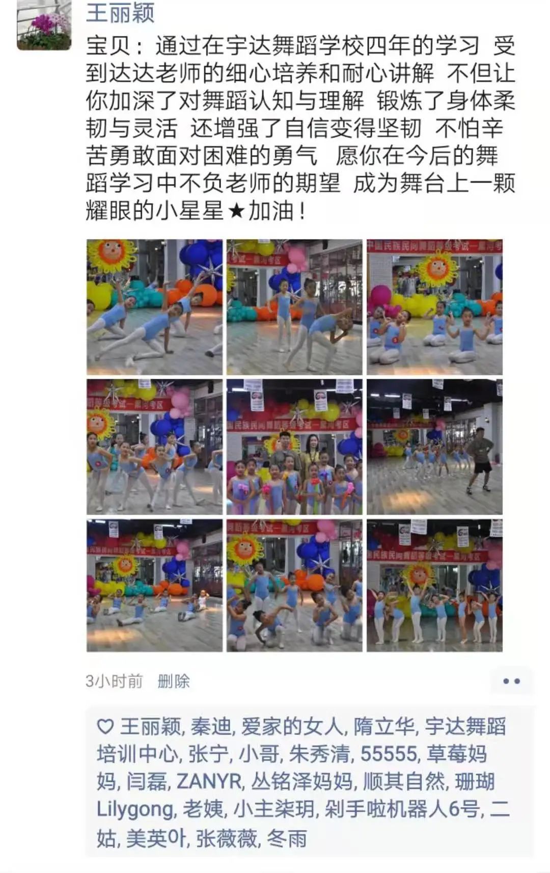 从不会穿舞蹈鞋,到现在可以独立站在舞台上完成演出,我很欣慰。感谢老师的付出与陪伴,一级到现在的十级,切实的看到了孩子的成长,树立了孩子的自信心,同时也体会到了团队的凝聚力。