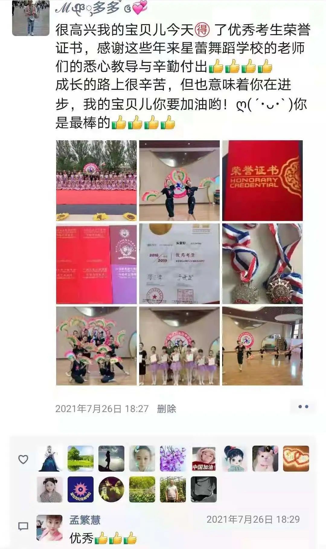 我的宝贝从4岁多就开始跟着达达老师学舞蹈,在学习的过程中,宝贝认真的跟着达达老师学着每个动作,她学的很快且很到位,让我非常骄傲。这次的舞蹈考级,虽然我没有来到现场,但是在达达老师录制的视频中,我看到了宝贝的努力和认真,并且得到了考官老师和舞蹈老师对宝贝的认可,真为她感到自豪。宝贝,舞蹈是你的爱好也是你的兴趣,希望你能坚持下去,在舞蹈上有更多的收获。