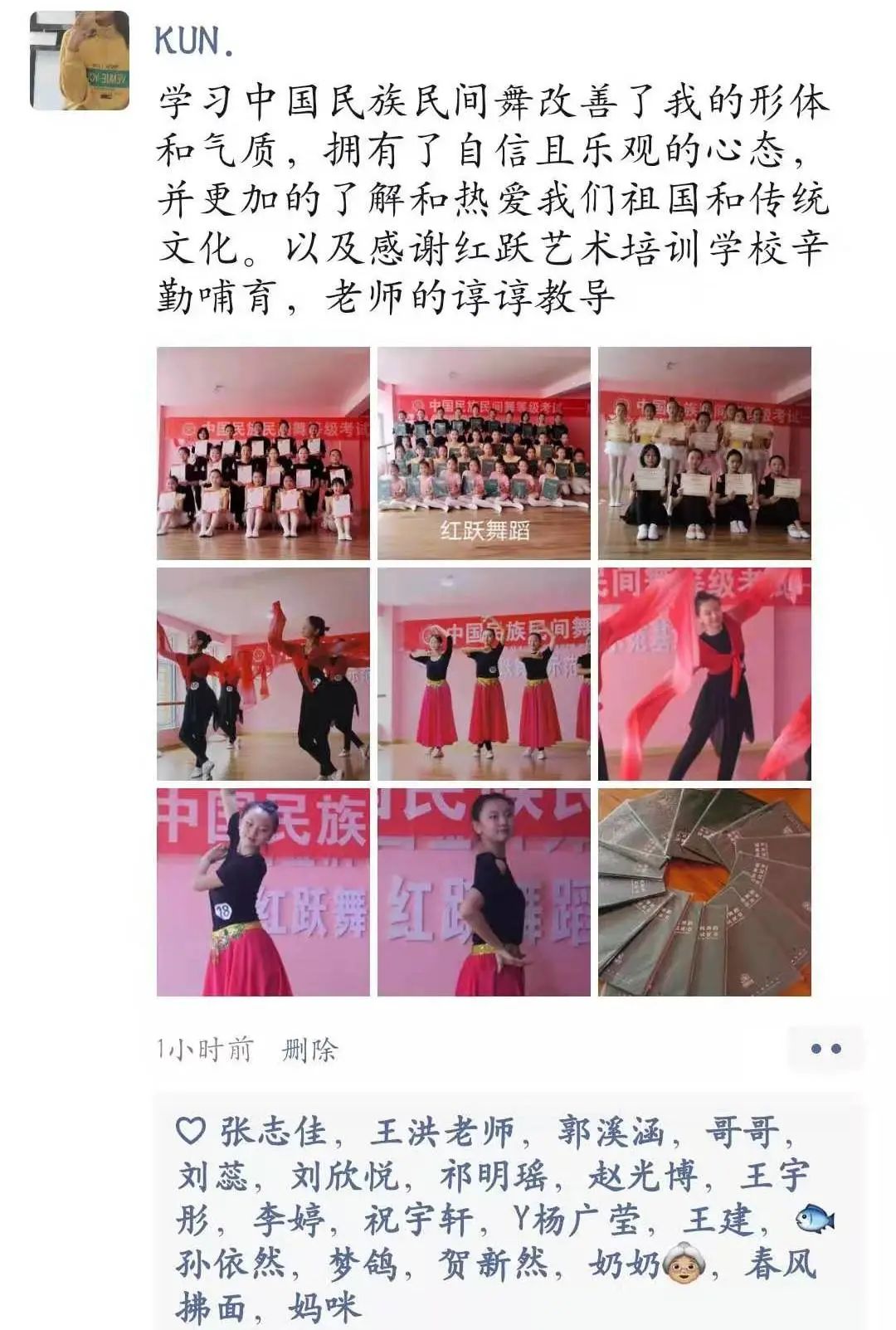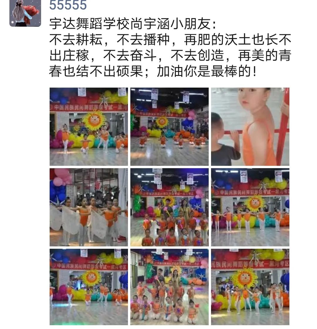 祝“宇达舞蹈”越来越好,祝达达老师桃李满天下!感谢中国民族民间舞蹈考级把男生的教材带给我们的宝贝,希望孩子能在这条路上快乐前行,全力进步!