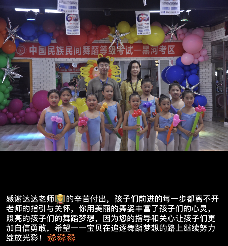 考级顺利结束了,感恩激动的心却一直无法平静,我是何其幸运的融入到中国民族民间舞考级中心这个大家庭!有黑河承办机构给我做后盾,我会更加努力钻研教材,让“星蕾舞蹈”的孩子们,在中国民族民间舞的滋养下快乐的茁壮成长!