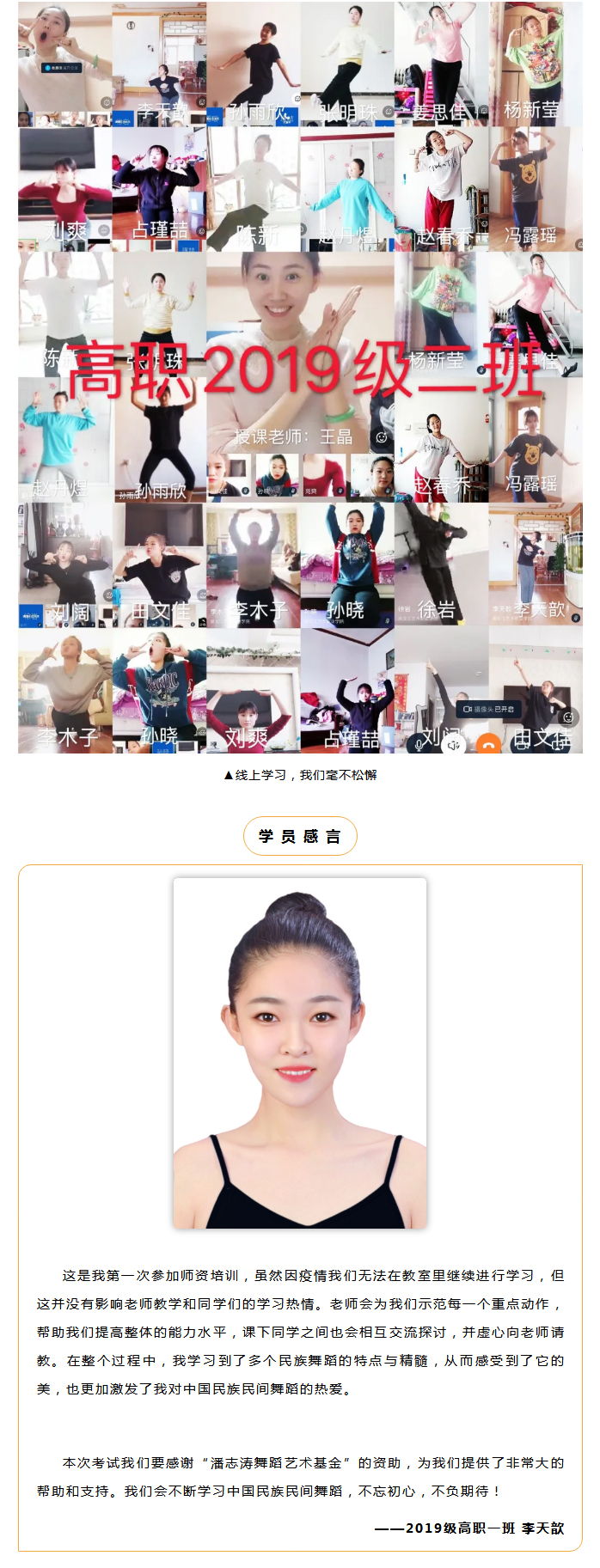 课程共建,满园芬芳。在这个特殊的学期,2018级、2019级高职的老师和学生们,没有因为疫情而耽误课程,共61名学生通过线上直播的学习方式,继续完成了本学期《中国民族民间舞蹈等级考试教材》1-3级、4-6级的课程内容,并于7月14日进行了线上考试。